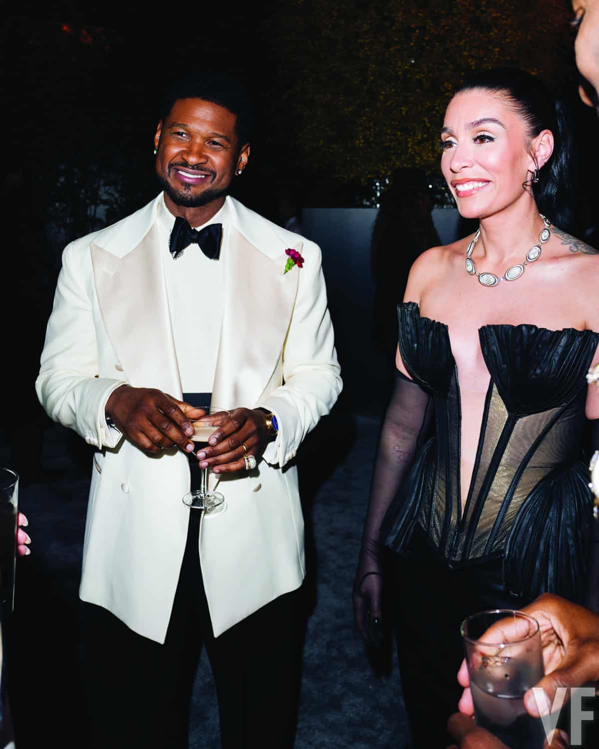 The dining room reflected a simplistic and modern aesthetic, filled by twelve round tables — topped with silver table lamps to create low, soft lighting, and yellow orchid flower arrangements — and black lacquer and wicker chairs. Throughout dinner, guests viewed the Academy Awards ceremony on large flat-screen televisions. While exiting the dinner space to move into the party, Grammy Award-winning performer Jon Batiste delivered a surprise performance for guests.
