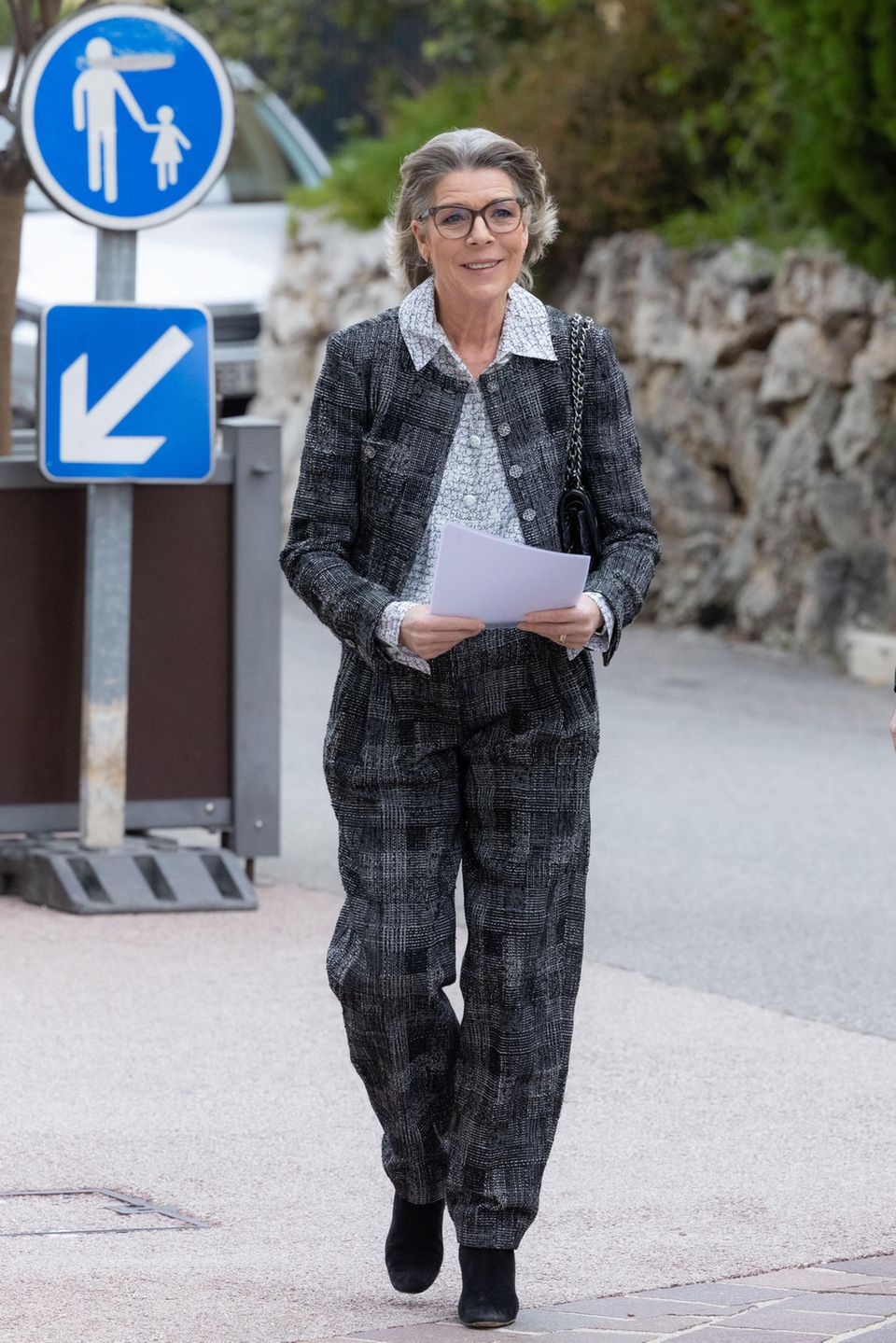 Caroline von Hannover’s style is impressive due to the skilful fusion of feminine elegance and boyish coolness. Contrary to expectations, she not only relies on feminine silhouettes, but also integrates masculine elements into her outfits. One example is a look by Chanel, in which she combines a classy blouse and a bouclé jacket with wide-cut trousers. The rule of matching two-piece outfits is maintained. By choosing ankle boots made of rough suede and a Chanel bag with silver hardware, she deliberately gives the elegant look a certain coolness.