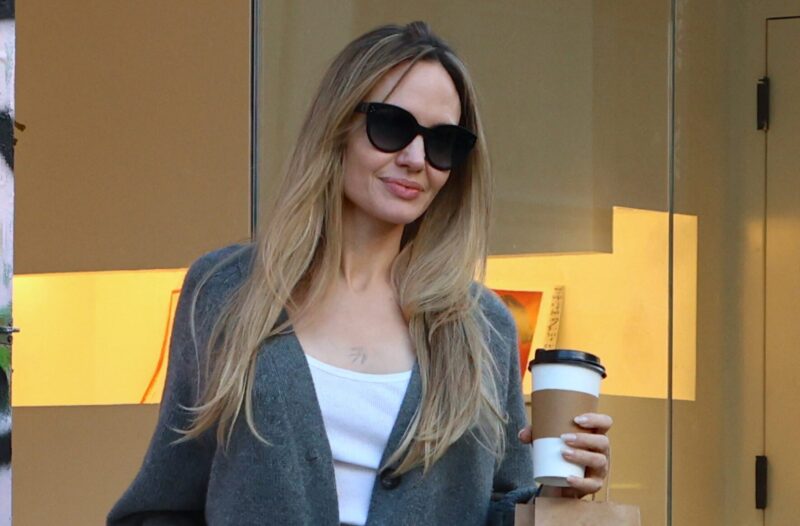 The Maria star teamed the cardigan with a simple white tank top and baggy black trousers. For footwear, she chose chunky black platforms—open-toed sandals that revealed her gorgeous burgundy pedicure. It’s a summer footwear model that Jolie keeps wearing, despite the cold temperature.