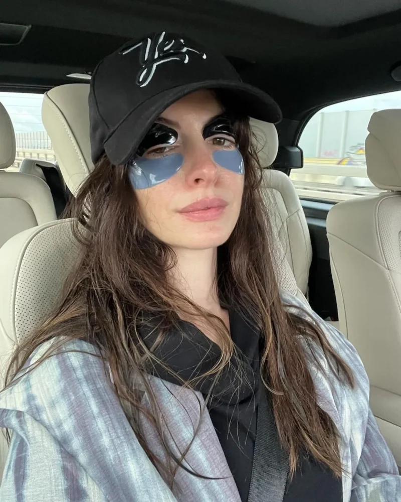 Another car selfie reveals the actor’s two-pronged approach to puffy eyes. On her undereyes, a set of 111 Skin’s Cryo De-Puffing Eye Mask, which cool, depuff, and hydrate the undereye in less than 20 min—but it’s adding the same brand’s Celestial Black Diamond Eye Mask on her top lids (firming, tightening, and smoothing) that makes her a multi-tasking skincare genius.
