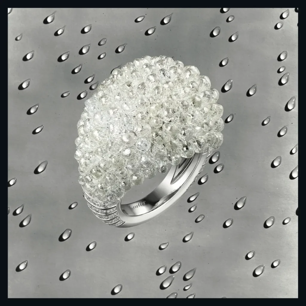 For nearly 180 years, they have explored every style, followed every inspiration, and made every technique their specialty. But at Cartier, they still manage to broaden the range of their know-how with creative ideas. In the latest Haute Joaillerie collection, it is a ring and a pair of earrings with which the Maison succeeds in reinterpreting the age-old briolette cut of a pear-shaped, fully faceted diamond. To do this, they simply took a large number of them and strung them like pearls on an XXL string. The effect is delightful: the cluster of stones makes the setting completely disappear in a playful way. The diamonds reflect the light off each other. The effect is like frozen foam that takes on a slightly milky hue: a surprise, magic in the hand.