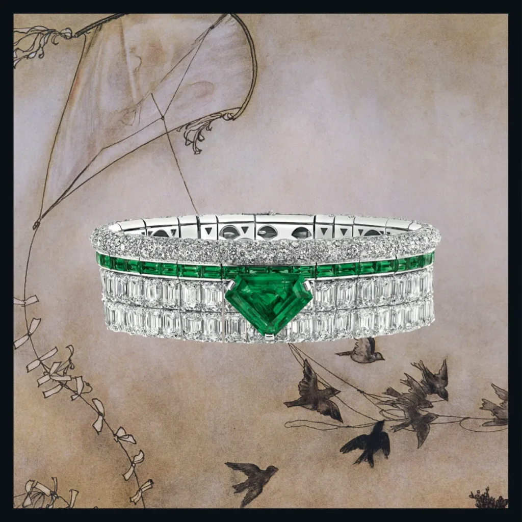This name has stood for the most extraordinary stones, and has done so for over sixty years: Graff. They are often so rare that all it takes is a majestic setting to create exceptional pieces of jewelry. This subtlety gives rise to an aesthetic of its own. And to its own know-how. The Colombian emerald that gives this bangle its green light is cut as boldly as a dragon: it literally jumps out from the row of smaller baguette-cut emeralds. The emerald-cut diamonds that surround it accentuate its volume – to the point where it seems as if the green giant is not lying on the band, but floating. The contrast of colors, deepest luminous green here, clear, flawless white there, contributes to the emblematic effect of this bangle. A creation that celebrates the precious stone as such: a miracle of nature, truly inimitable in its aura and presence.