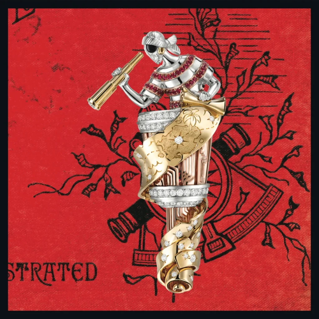 These pieces of jewelry are a dream, not least because Van Cleef & Arpels specializes in figurative representations. “Treasure Island,” the famous novel by Robert Louis Stevenson, provided the motifs for the latest high jewelry collection – a splendid opportunity to appropriately showcase the house’s craftsmanship. The three pirate clips are named after John, David and Jim from Stevenson’s book. First, the figures were molded from wax and then melted in the three gold colors. Accuracy also plays a major role in the depiction of “Jim.” The overall composition and the setting of the stones contribute to the naturalistic illusion . The rubies, diamonds and blue sapphires are like the pattern on his shirt. The shimmer of the fabric, the headscarf, the map with Treasure Island on it, the binoculars that “Jim” holds in his hand on his lookout: pure cinema. Magnificent throw.