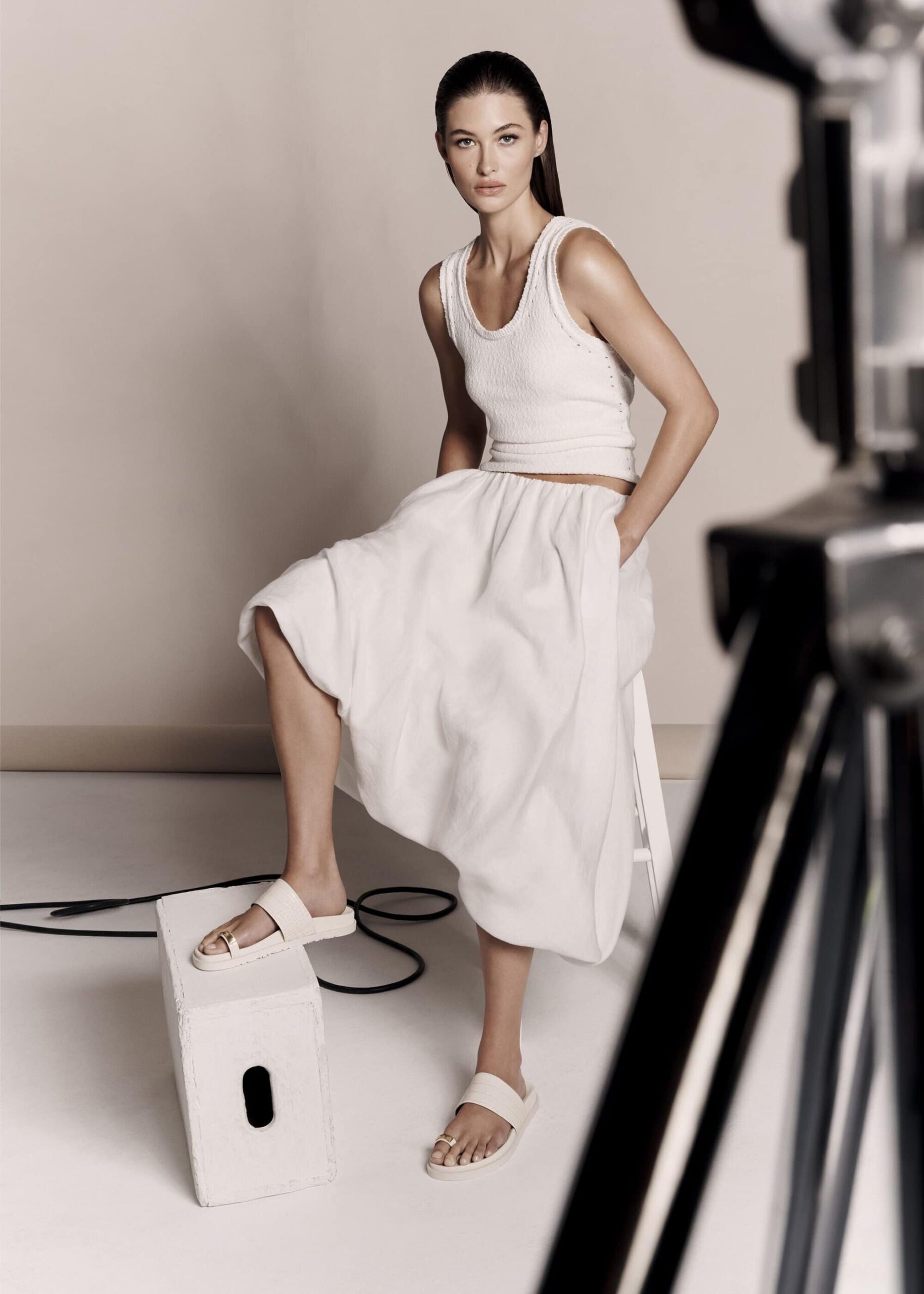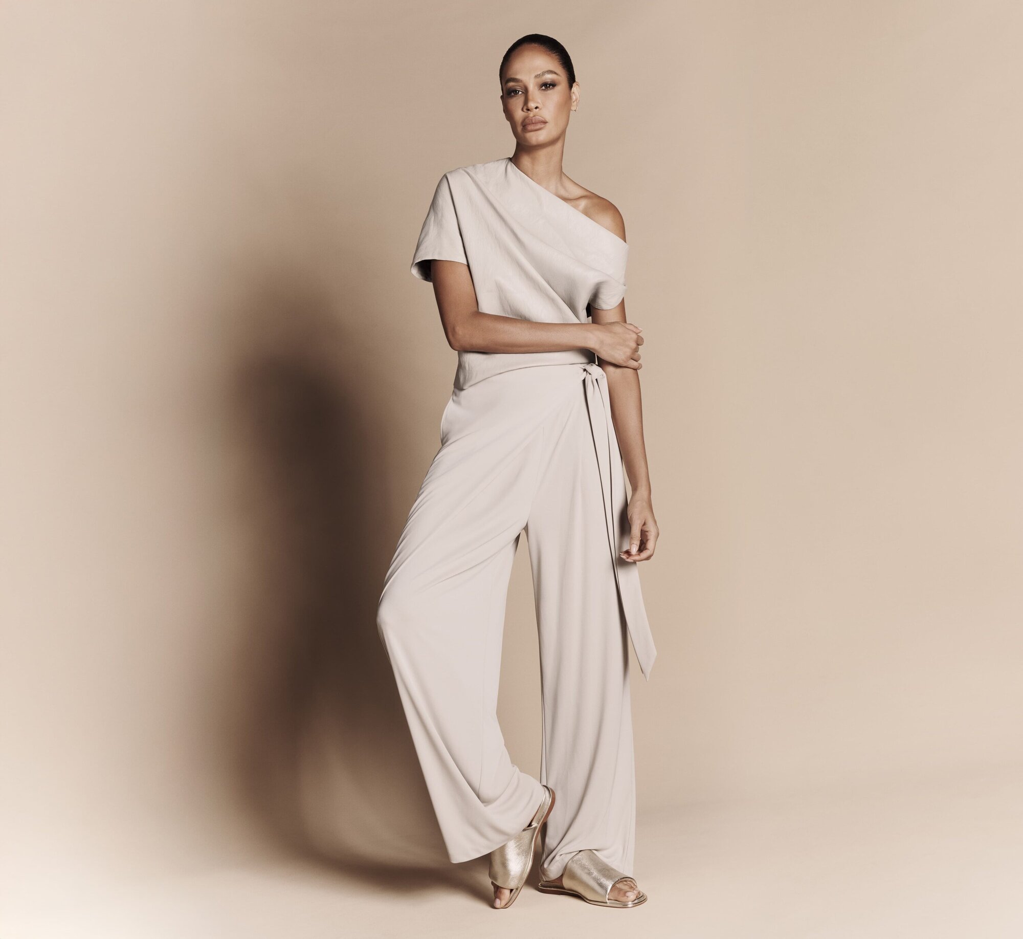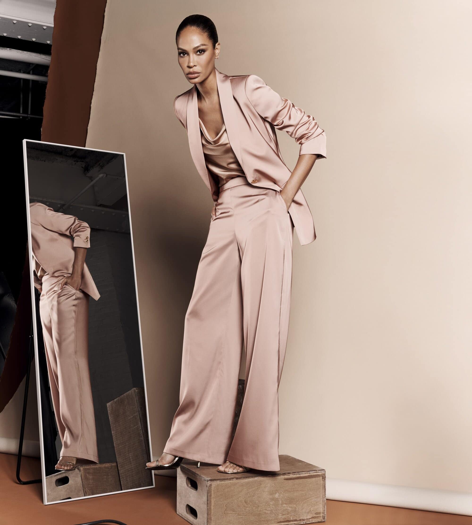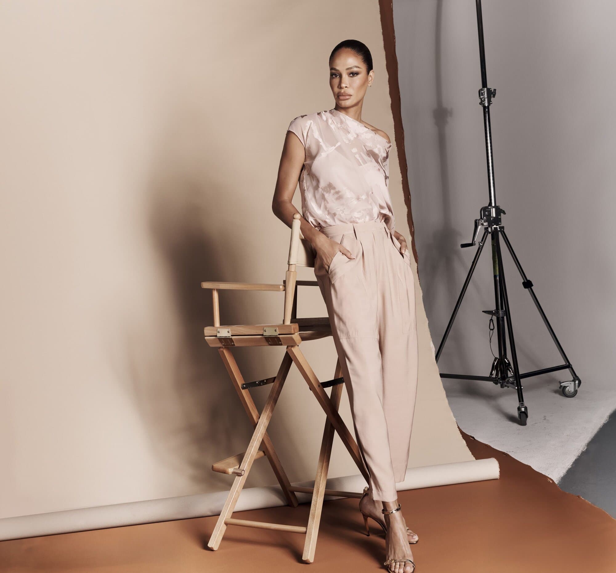 Visually, the campaign unfolds as a study in controlled intimacy. Adriana’s edit centers on power rendered in understatement: belted trenches, fluid suiting, pale gray monochromes worn close to the body. Her presence is luminous without excess, projecting confidence that feels lived rather than performed. Joan’s selections introduce a sculptural sensuality—bias-cut dresses and sharp tailoring in muted tones of snow petal pink and Umbria clay. The silhouettes emphasize line and proportion, where the slightest gesture carries intention. Grace, meanwhile, leans into ease through ribbed knits, low-slung skirts, and draped separates that nod to Donna Karan Weekend. Her palette is lighter, her posture relaxed; the clothes appear to move with her rather than around her. Styled by Jessica Diehl, the trio’s wardrobes converse rather than compete, presenting a collective portrait of femininity that is multi-generational and assured.