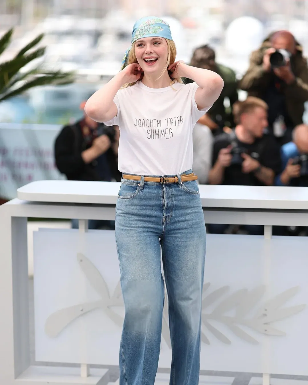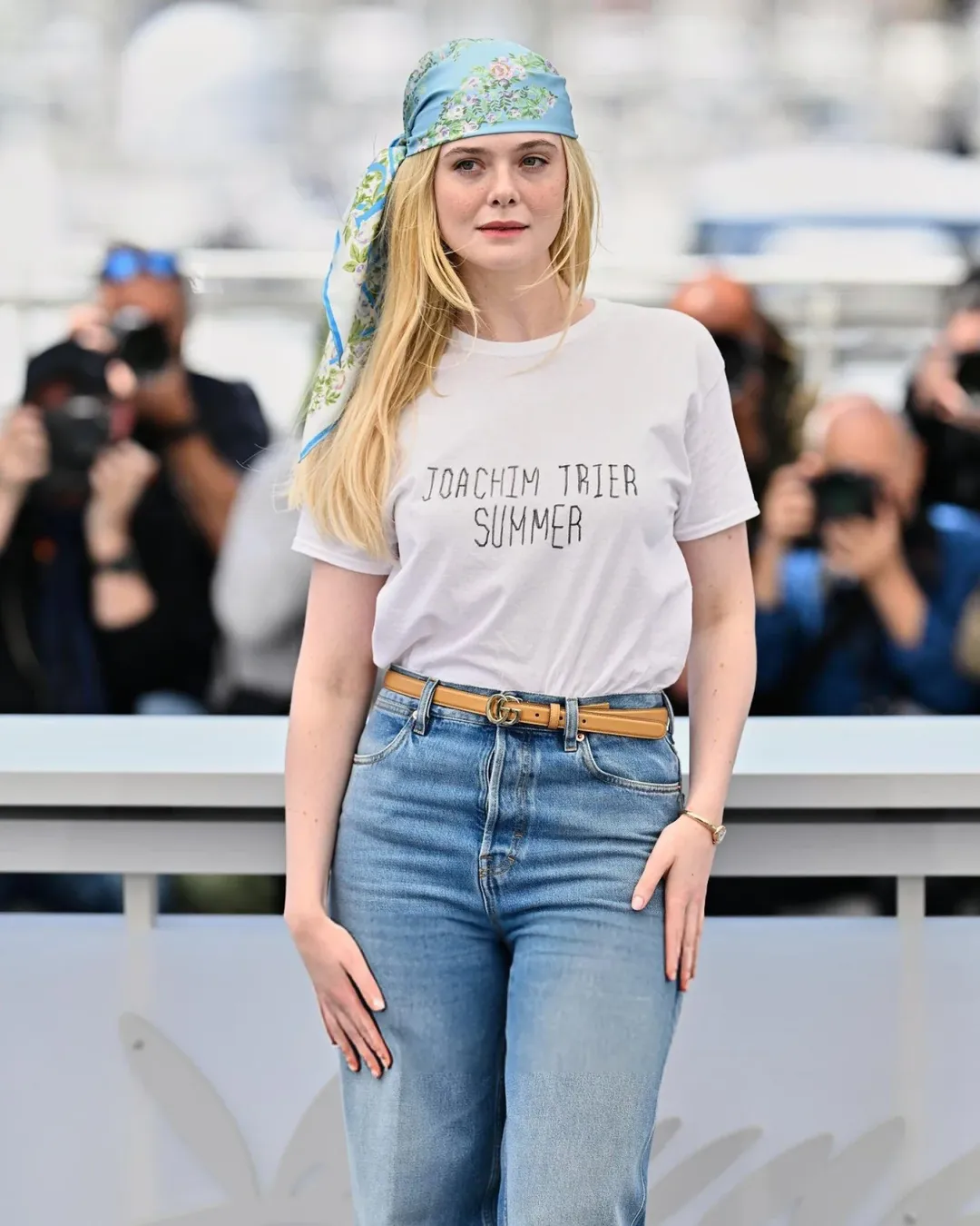 To complete the look, Fanning wore light wash flare jeans, chunky wooden platforms and an elegant silk scarf tied around her head – a cheeky ’70s moment on the Croisette. Are you ready for Joachim Trier summer?