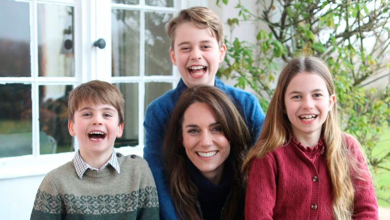 Kate is seen seated outside, surrounded by her three children, Prince George, Princess Charlotte and Prince Louis, in the photo credited to the Prince of Wales.