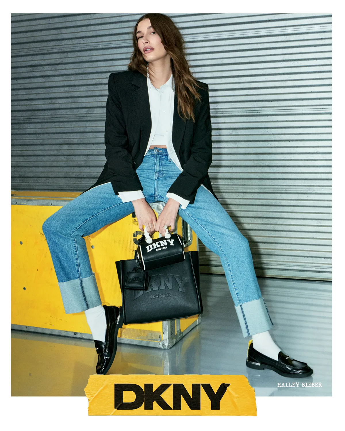 Laird said they shot the campaign in a warehouse in downtown L.A. “It’s kind of like an industrial warehouse space.” He said he worked with Stefan Beckman on compiling different elements that brought in DKNY’s signature yellow. “We wanted a simple industrial world of textures, but really it was all about Hailey, and capturing her attitude and style and really just making it very simple,” he said.