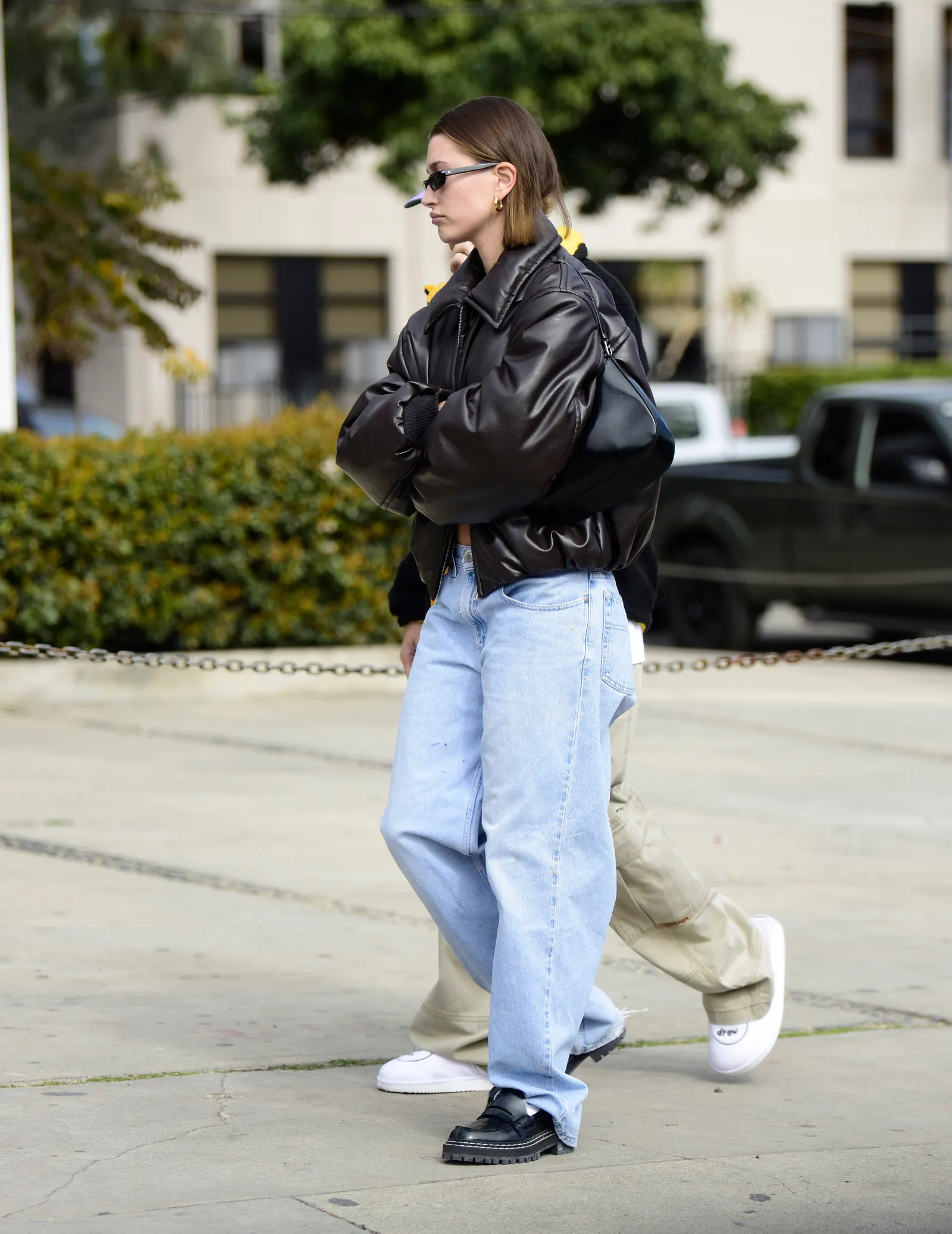 The bomber jacket has surpassed trendy and moved into wardrobe staple territory thanks to its transitional qualities. Layer it over a turtleneck come winter, or wear it with a simple sweater during the fall. Bieber often styles hers with light-wash denim and a chunky shoe.