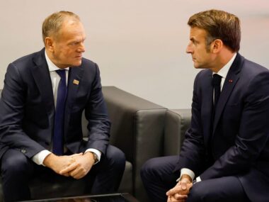 Polish Prime Minister Donald Tusk shakes hands with French President Emmanuel Macron, at the Chancellery of the Prime Minister, in Warsaw, Poland, on Thursday. “To cut off speculation about the potential presence of this or that country in Ukraine after reaching a ceasefire. The decisions concerning Poland will be made in Warsaw and only in Warsaw,” Tusk said. “For now, we do not plan such actions.”
