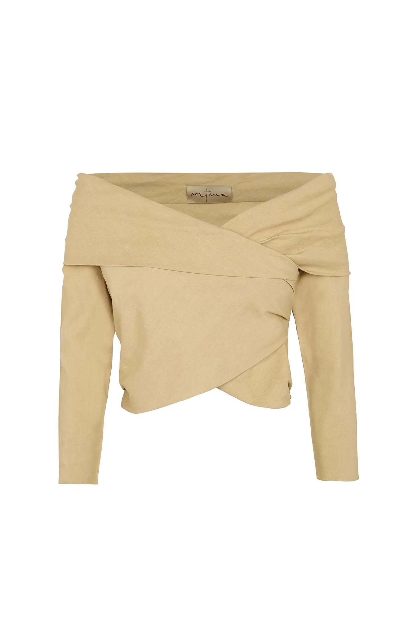 Fitted top in stretch hemp and viscose fabric, with French sleeves and a Bardot neckline with a crossover effect and asymmetric hem that closes with a side zipper by Cortana (435 euros)