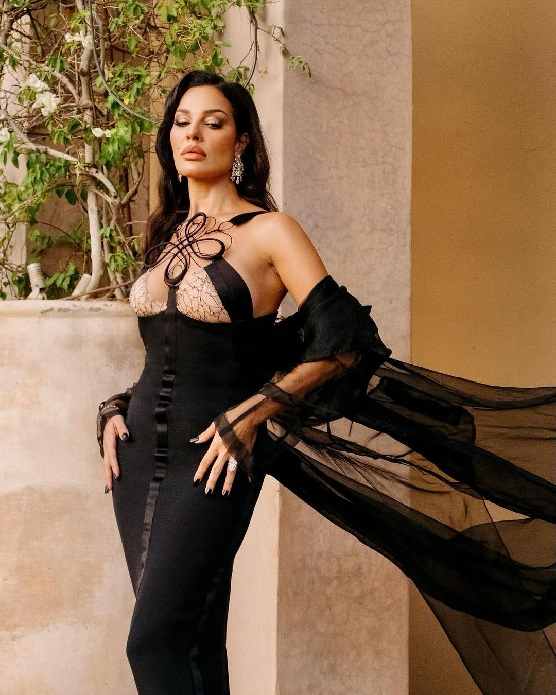 For the star-studded ceremony in Marrakech, the Lebanese actor wore an archival Jean Paul Gaultier look, picked from the designer’s Spring 2009 haute couture collection by stylist Bilal Fakih. The black gown came with a figure-hugging silhouette, a statement bodice, and geometric details along the neckline. Paired with a sheer floor-grazing cape, the darkly romantic look aligned with the fashion world’s goth resurrection, and affirmed by Nassib Njeim’s black manicure for the evening — imagine, a modern-day Arab Morticia Addams, if you will. The star went minimal with her jewelry, only wearing a dainty diamond bracelet and chandelier earrings by Chopard.