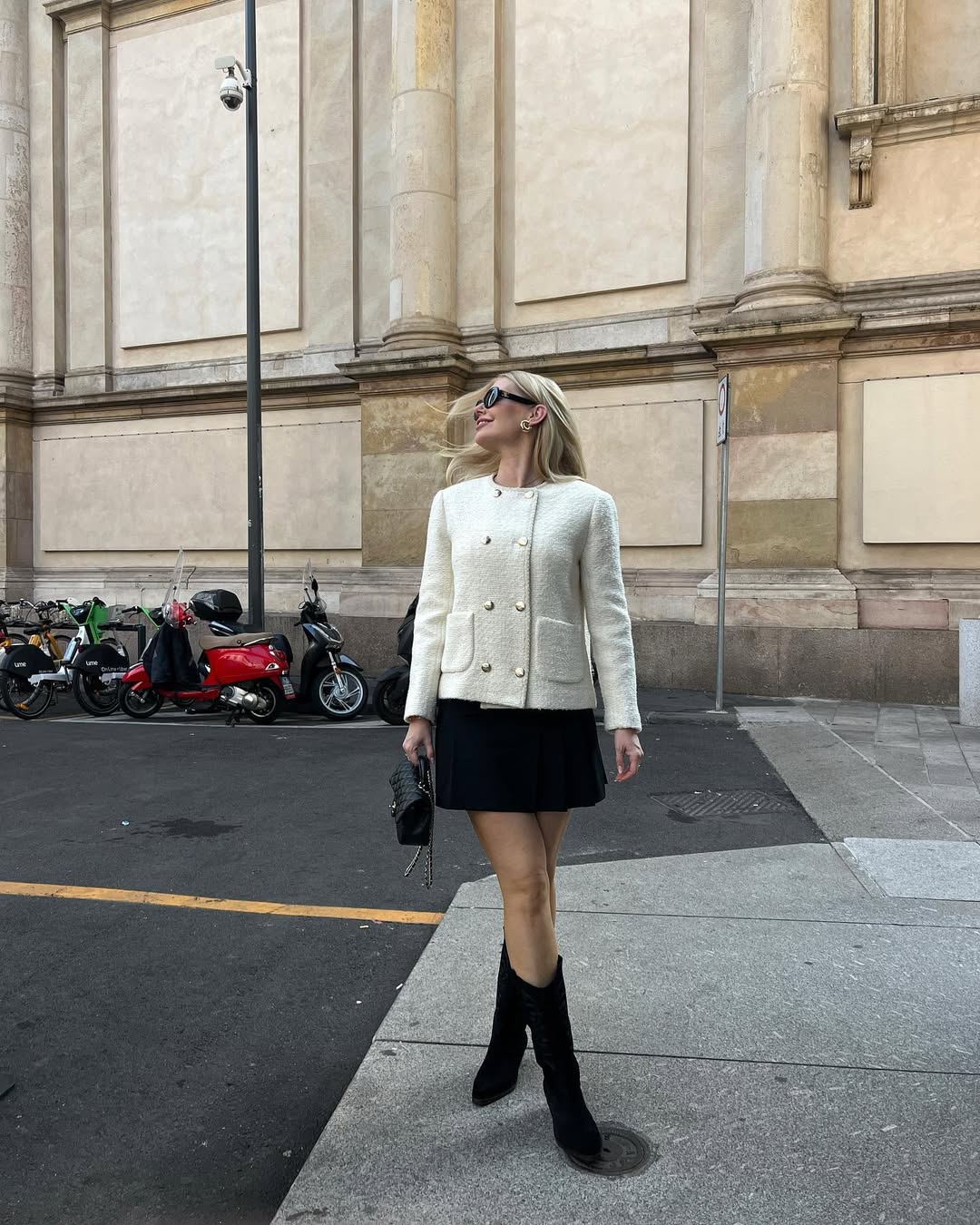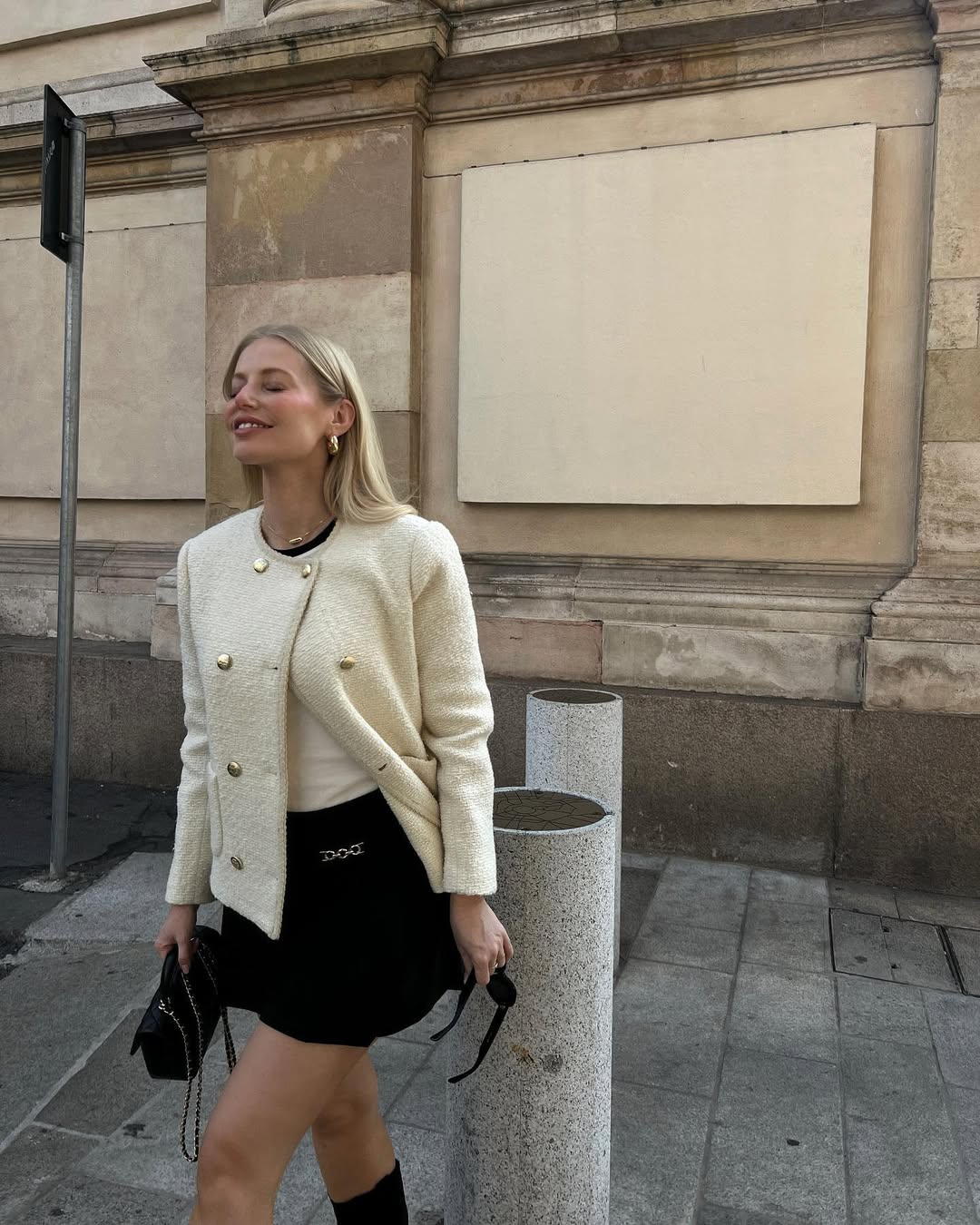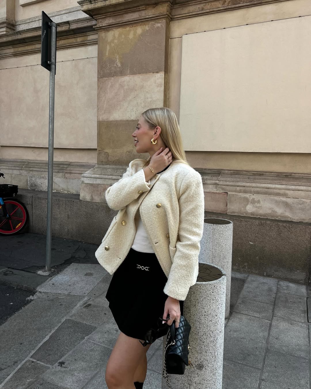 The situation is now changing: the versatile jacket is facing nostalgic competition from the feminine bouclé or tweed jacket. These models from bygone times are soft, feminine and have a flattering short cut and offer a refreshing alternative to the current, oversized blazer, which is more reminiscent of traditional men’s wardrobes. Find out everything about this trend here, how you can combine it stylishly and where you can find the right pieces.