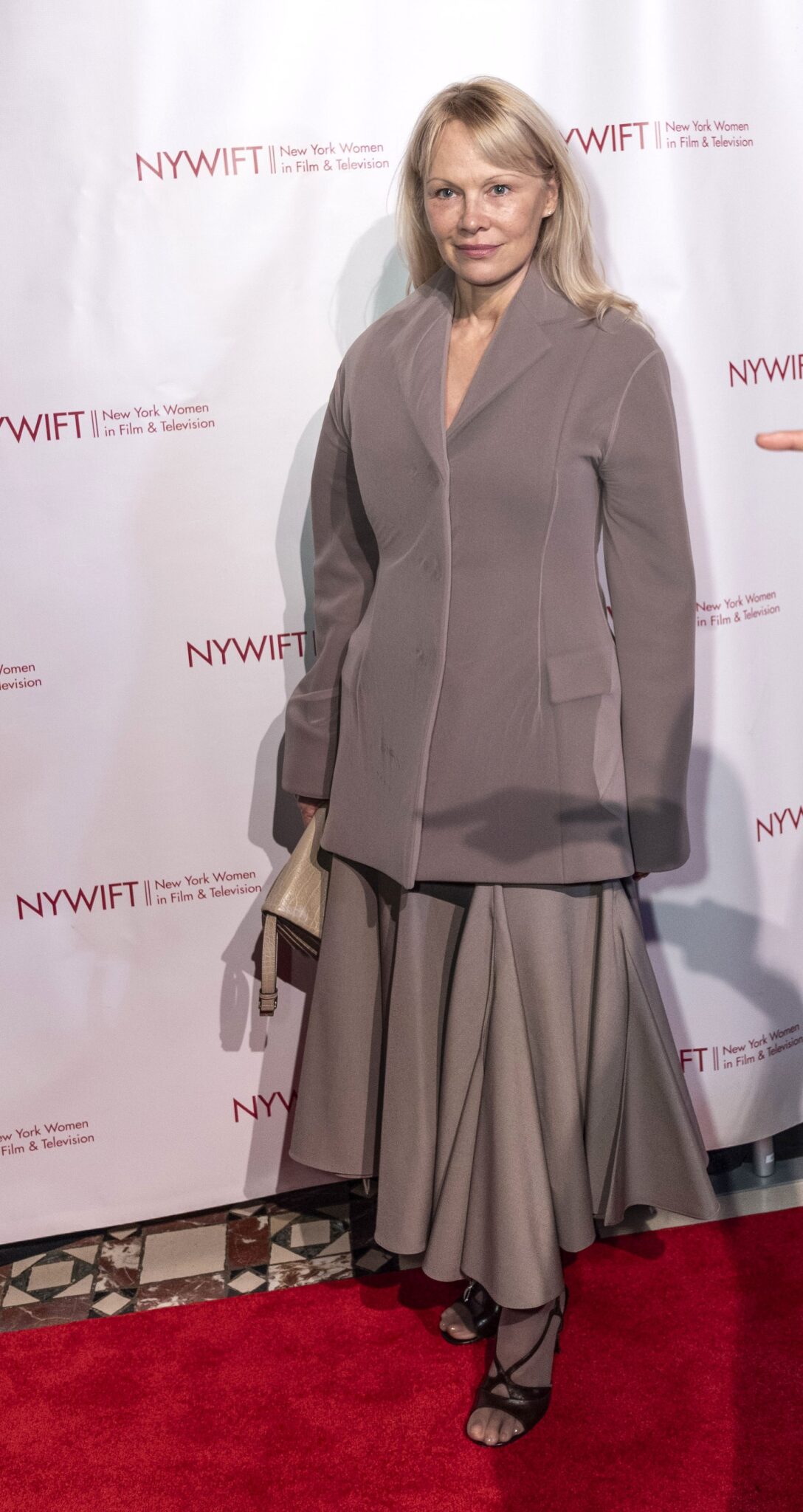 The outfit was first seen at the brand’s Fall 2025 show last month, and Pamela’s look focused on textures as well as subtle tonal shifts. The Last Showgirl star wore a longer button-down hourglass jacket, cinched in at the waist – to accentuate it, with slight volume at the shoulders and a loose bottom hem. These details were unusual enough to attract attention, but the real star was the thin, sheer fabric that made the jacket look like it was wrapped in airy spider silk.