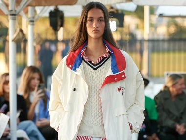 The first model wore a white sailing blouson that featured an ersatz America’s Cup–esque house sailing club logo over a red striped shirt and cricket-ish sweater. Later, a transparent parka shot through with what looked like fishing line was cut, designer Maggie Hewitt said, from an upcycled sail. It rustled as its wearer propelled it under the sun umbrellas.
