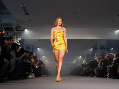 Kim Kardashian’s wild Balenciaga autumn/winter show look has since faded into the canon of wild Kim looks with her veiled Met Gala 2021 moment and her ode to Marilyn Monroe a year later. When Gigi Hadid cropped up on the Vetements spring/summer 2025 runway at Paris Fashion Week wearing a similar packing-tape yellow get-up, it brought memories of Kim ASMR-ing her way into Le Bourget back again. The Vetements X DHL link-up actually harks back to the spring 2016.