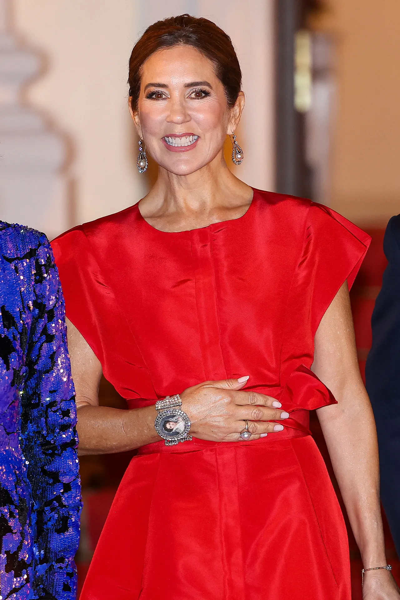 As for Queen Mary, her choice of outfit was characteristically laden with historical symbolism. Donning a sweeping red dress as she joined the heads of state from Norway, Sweden, Finland and Iceland, Queen Mary (fresh from her recent solo trip to Brazil) stood side-by-side with Prince Jorge V – and even re-wore the drop earrings that she chose for her wedding day.