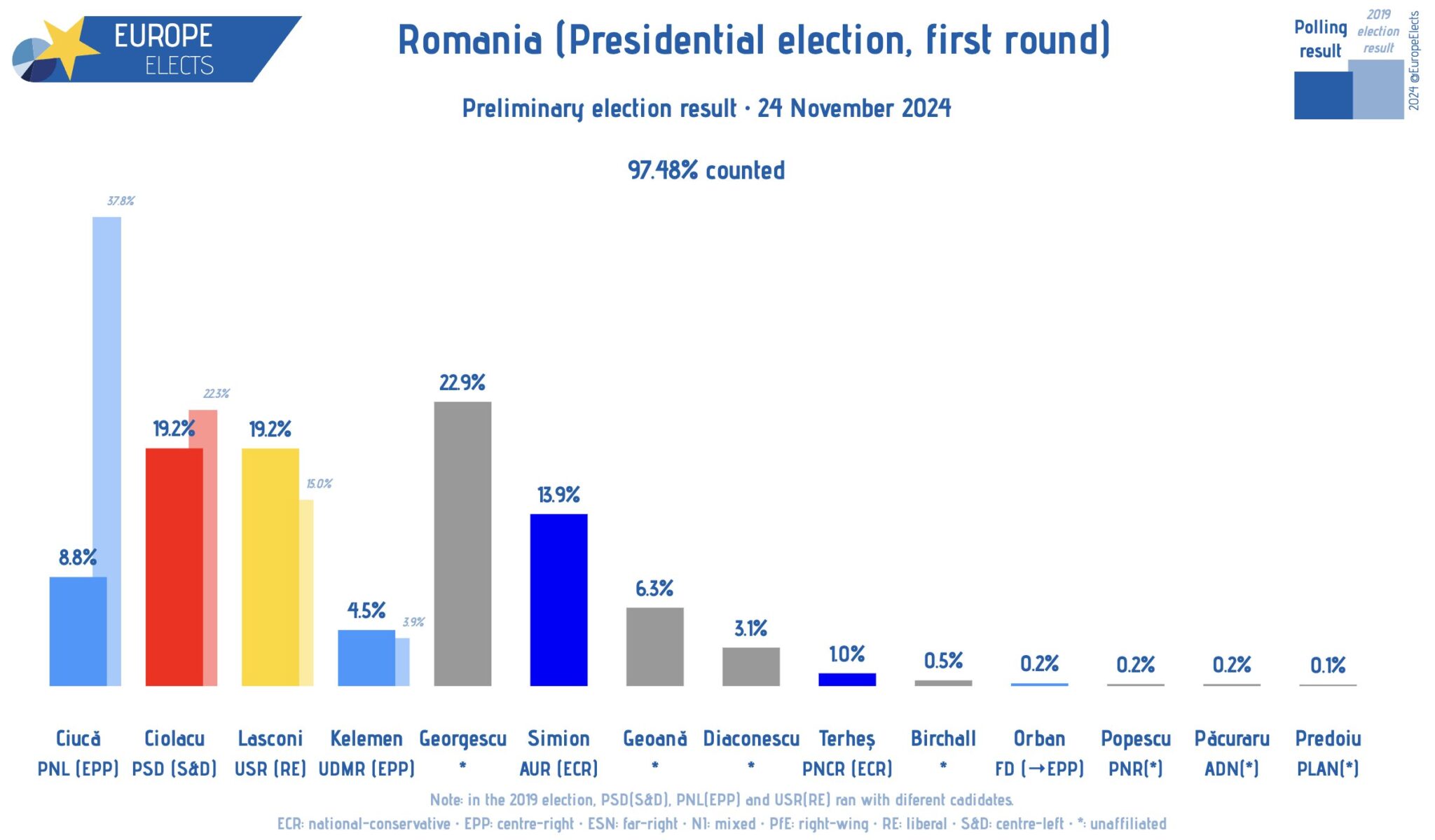 The result also exposed the weakness of exit polls, which had projected Ciolacu as the frontrunner, followed by Lasconi. Voter turnout was consistent with the previous election at 51%.