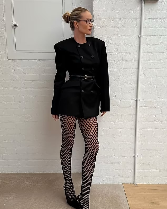 The 37-year-old blonde looked elegant in a jacket with 80s-style shoulder pads and a thin leather belt. As accessories, she chose fishnet tights, high black stilettos and black glasses.
