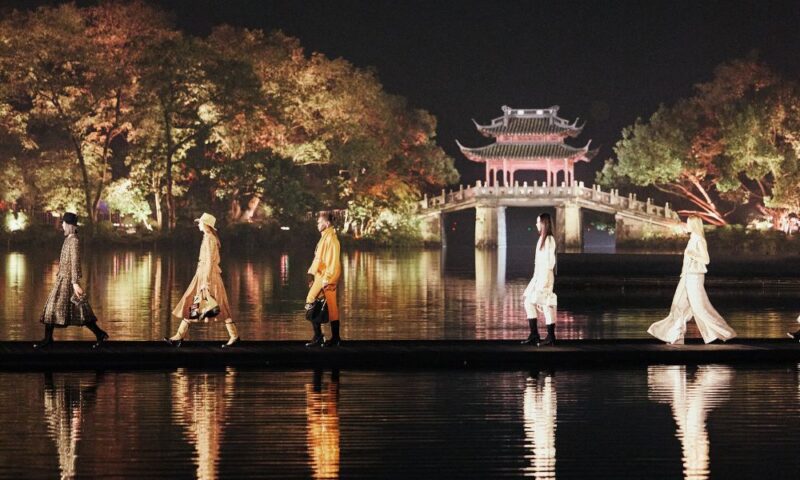 The lake, with serene natural beauty said to have inspired the works of many great Chinese poets and artists, provided a stunning backdrop on nightfall as models walked out on a wooden runway across the water.