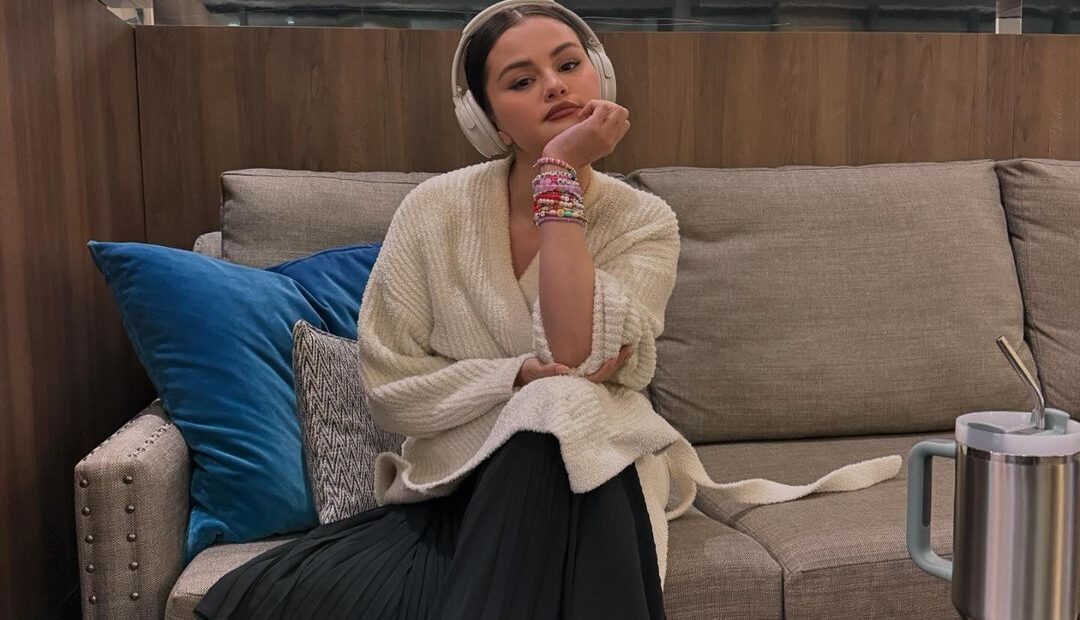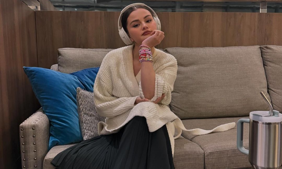 In hotel pics and waiting rooms, Gomez seems utterly at peace, singing in Spanish with her costars, playing with her hair, and enjoying the face on her designer purse. In one pic, she takes a moment to herself while watching, we’re pretty sure, a cooking show, and as for what that teddy bear emoji might be covering let’s not even speculate. Her stack of friendship bracelets, enormous headphones, and stainless steel Stanley tumbler is basically everything millennials have been told add up to self-care. It’s a vibe for sure.